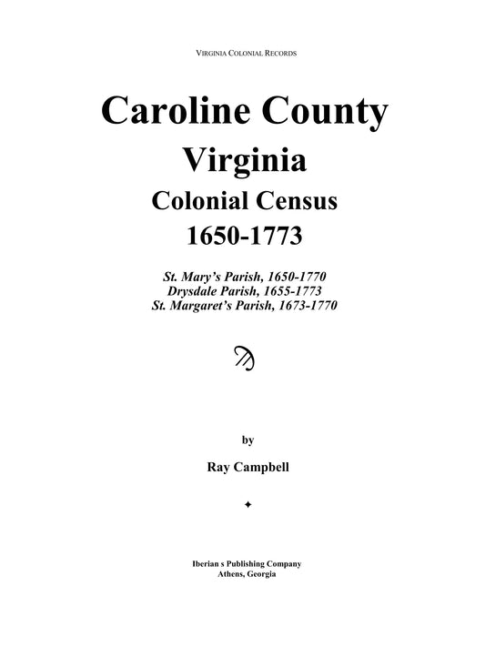 Caroline County, Virginia Colonial Census, 1650-1773: St. Mary's District, 1650-1770; Drysdale District, 1655-1773; St. Margaret's District, 1673-1770