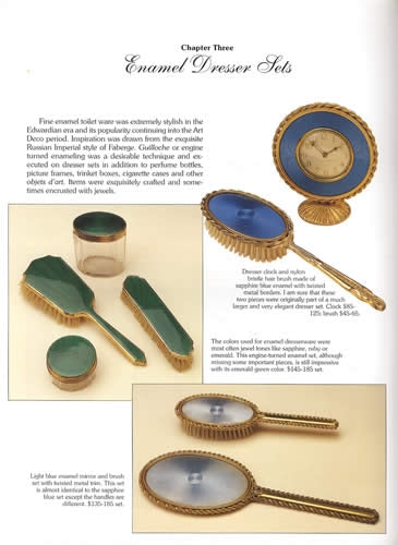 Here are hundreds of elegantly designed matching dressing tools in metals, plastics, enamels, and glass presented in boxed, travel, and manicure sets. Even special boxes, lined with luxurious fabrics housing items for individual boudoir tasks, are included. Over 340 color photographs, including over 100 authentic catalog pages, are on display. They accurately portray the magnificent creative skills and use of fine materials for each elegant and glamorous item that has been carefully cherished and preserved throughout the years.