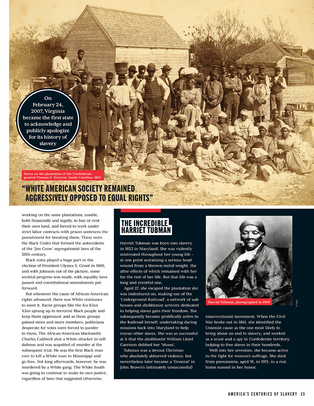 From slavery through the election of Vice President Kamala Harris, here is the history of Black America told through striking photographs and compelling narrative that captures many of the key joys, struggles and milestones. Learn about the first Black Americans and the origins of slavery, including Harriet Tubman, Nat Turner's Rebellion, Frederick Douglas and the Civil War. Explore the long fight for freedom through Jim Crow, W.E. Dubois, the Tulsa Massacre and the rise of MLK, Malcolm X and the Black Panther Movement. Discover the joys of the Harlem Renaissance, Jimi Hendrix at Woodstock and the rise of Hip Hop. And find out the story behind Muhammad Ali's Rumble in the Jungle, the desegregation of professional sports, and how black sports stars from Hank Aaron to Lebron James have fought to make their voices heard.