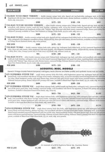 The 15th Edition also showcases the full color Photo Grading System (a Blue Book Publications, Inc. exclusive!). The Photo Grading System is the consumer's best tool to correctly ascertain the various grades of both new and vintage acoustic instruments. These high resolution color photos enable even a novice to lock into each guitar's unique condition factor easily and accurately, showing a variety of real world condition factors over a wide range of instrument models and configurations. Why guess when you can be sure?