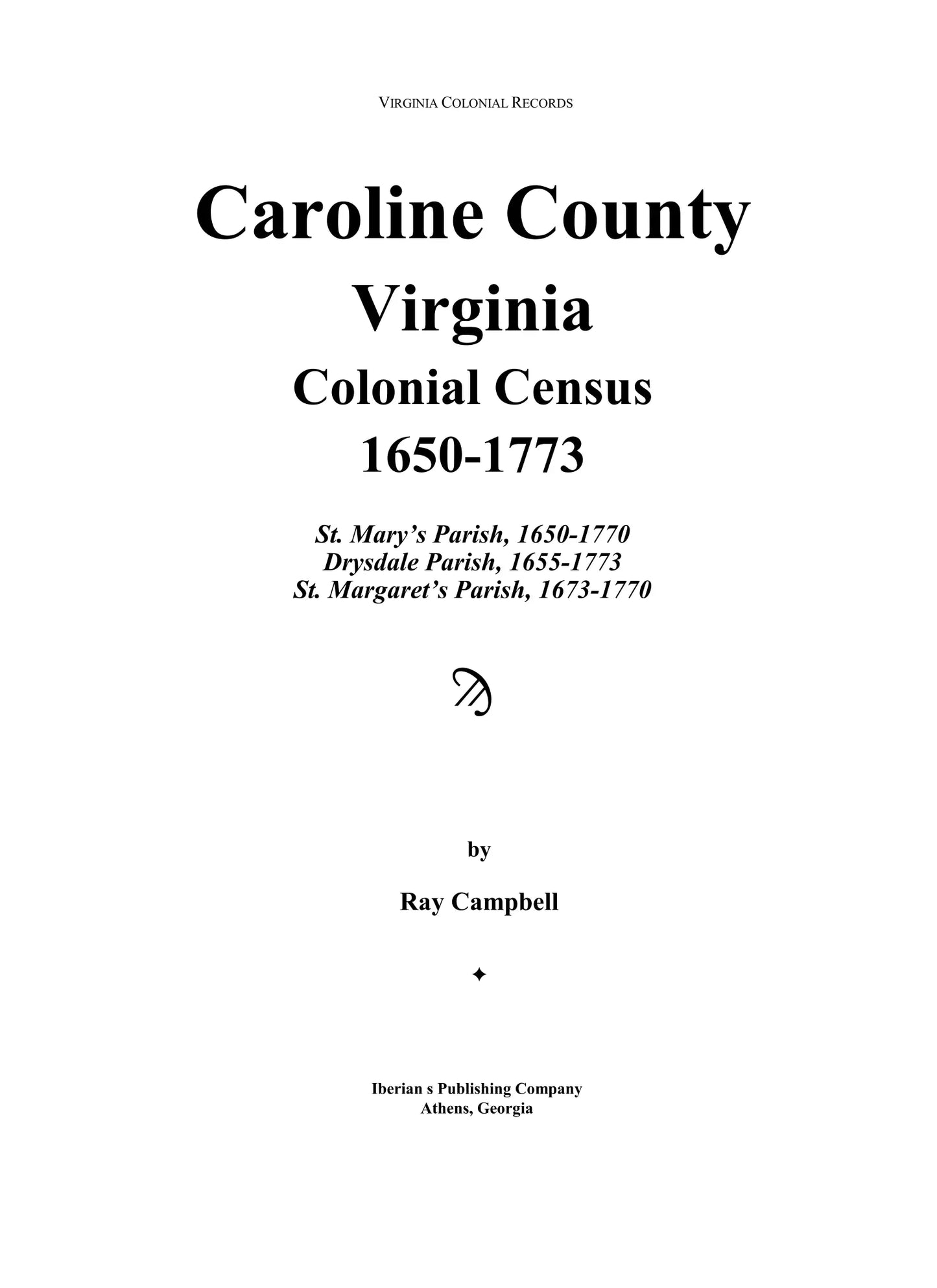 Caroline County, Virginia Colonial Census, 1650-1773: St. Mary's District, 1650-1770; Drysdale District, 1655-1773; St. Margaret's District, 1673-1770