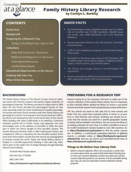 Like other publications in the Genealogy at a Glance series, this one takes a large subject and narrows it down to its essential elements, covering the basics of research in an amazing four pages. But this piece is just a little different; besides pointing out the best and most helpful websites, listing the most useful books and articles, and providing tips for further research, it also tells you how to prepare for a research trip to Salt Lake City and suggests things to do in the city when you take a break from your research. It even offers suggestions for dining and accommodation!