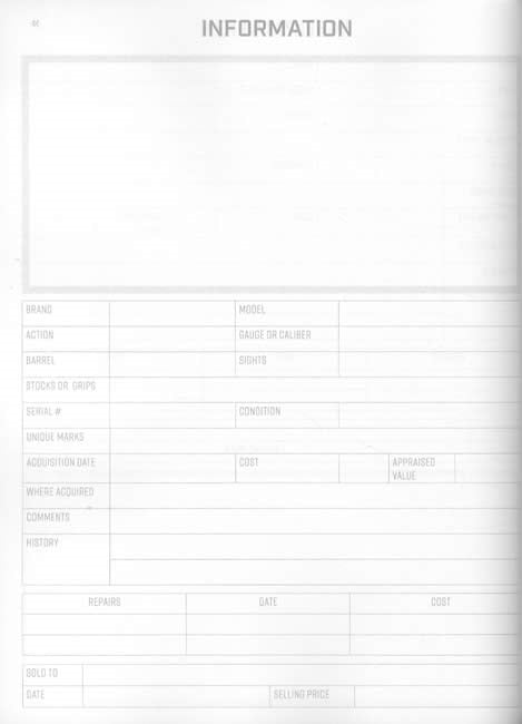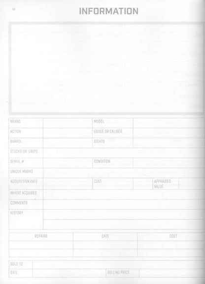 • Gun Information - Record Brand, Model, Action, Gauge or Caliber, Barrel, Sights, Stocks or Grips, Serial #, Condition, Unique Marks, Acquisition Date, Cost, Appraised Value, Where Acquired, Comments, History, Repairs, Sold To, & Selling Price.