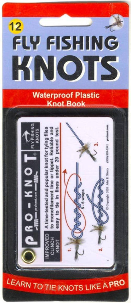 Six water-proof plastic cards riveted together with a brass grommet in a fan pack detail the 12 best fly fishing knots. Put a set in your vest today!