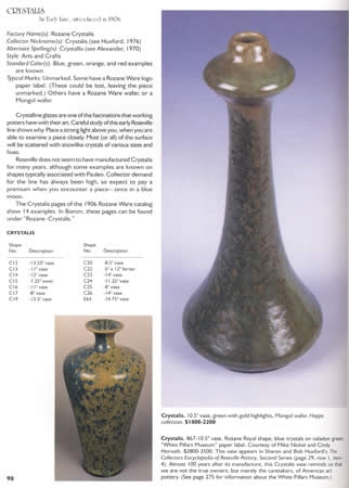 Previously unknown Roseville products are documented -- most notably Early Velmoss. Also included in the text are discussions of experimental and trial glaze pieces, a glaze and shape identification guide, a timeline of Roseville products, and an examination of the company's factory marks and artist signatures.