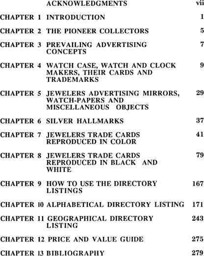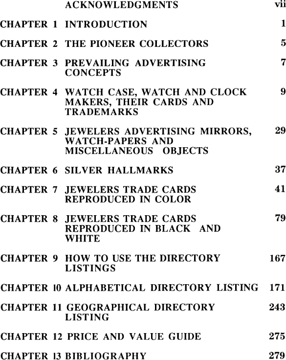 A chapter is devoted to watches and clocks, and sets forth trademarks for both foreign and domestic wares up to the turn of the century, as reported by JCK at that time. Specialty collector's items such as Watch Papers, advertising mirrors, and boxes are also illustrated.