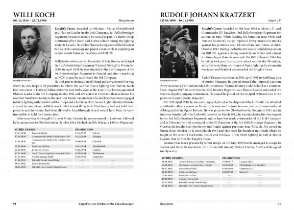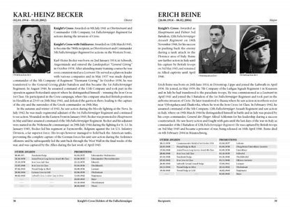 Presented here are the biographies of the 130 men of the Fallschirmjäger--Hitler's elite paratroopers, who won the Knight's Cross and its higher grades. These men fought on nearly every front during the Second World War, from their first action in Denmark in April 1940, to their last major battle at Monte Cassino. A total of twenty-four Knight's Crosses were awarded to Fallschirmjäger troops during the battles of Monte Cassino and in the airborne invasion of Crete with the remainder awarded during the fighting in France, Belgium, Holland, Italy, Russia, and at least one in North Africa. These tough, elite soldiers parachuted behind enemy lines and were one of the most successful units during the Second World War. The book gives details of their promotions and other medals and decorations and is well illustrated with over 200 photographs.