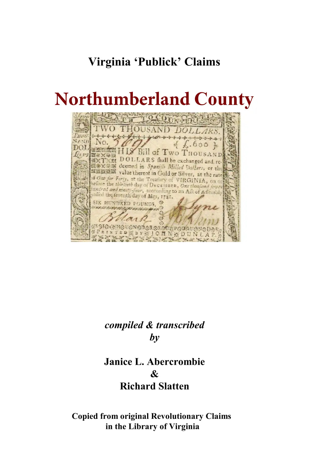 This is the Northumberland County entry in the series of Virginia Revolutionary "Publick" Claims booklets containing useful information about the contributions of ordinary people to the Revolutionary War.