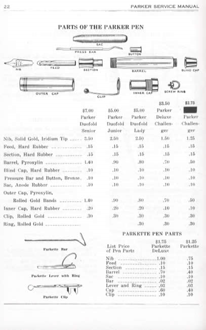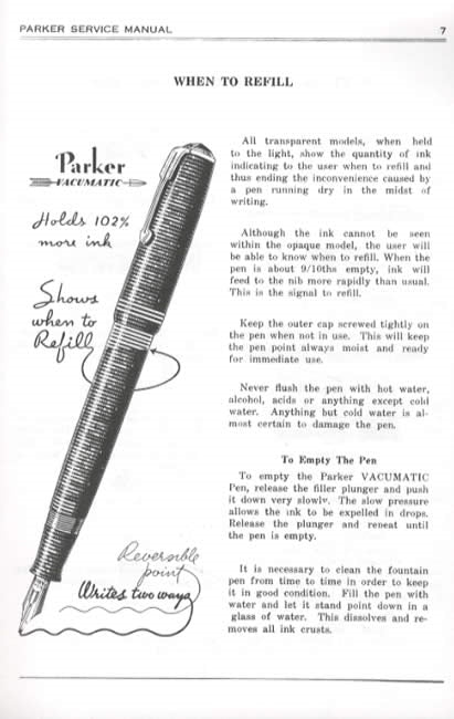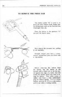 No one should attempt to repair or to adjust a fountain pen until he is familiar with the mechanical characteristics of that pen. With the help of the directions in this service manual, a dealer can quite easily remedy the ordinary complaints made by a customer.