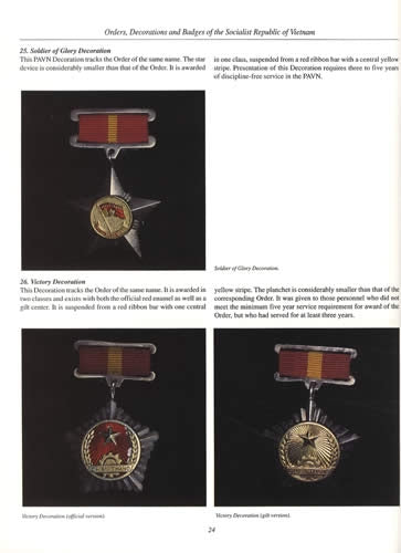 The Orders and Decorations of the "enemy" during the Vietnam War have remained shrouded in mystery for many years. References to them are scarce and interrogations of captives during the war often led to the proliferation of misinformation concerning them. To confuse the situation even more, these awards were bestowed by the Socialist Republic of Vietnam (SRV), known then as the Democratic Republic of Vietnam (DRV), and the National Front for the Liberation of South Vietnam (NLF), and a myriad of political and local organizations. Covered are those Orders and Decorations now considered official by the SRV, as well as many of the obsolete awards bestowed by the DRV and the NLF. It also discusses many of the commemorative, political and local awards. Includes value guide.