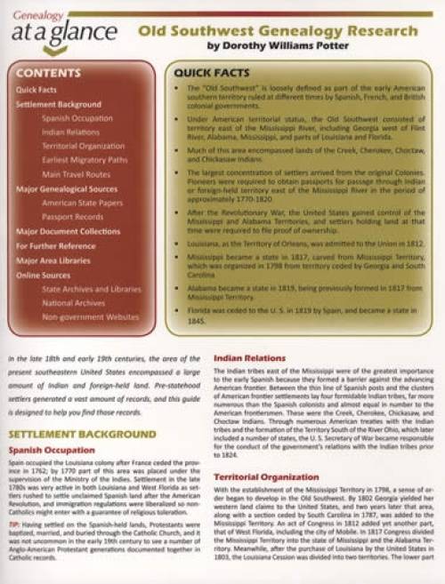 In keeping with the Genealogy at a Glance series, this research guide also contains a helpful list of books and articles for further reference, a list of major area libraries, and a list of online sources. In its entirety, it is a four-page distillation of the key ingredients of Old Southwest research, which can be read at a glance and used with total confidence.