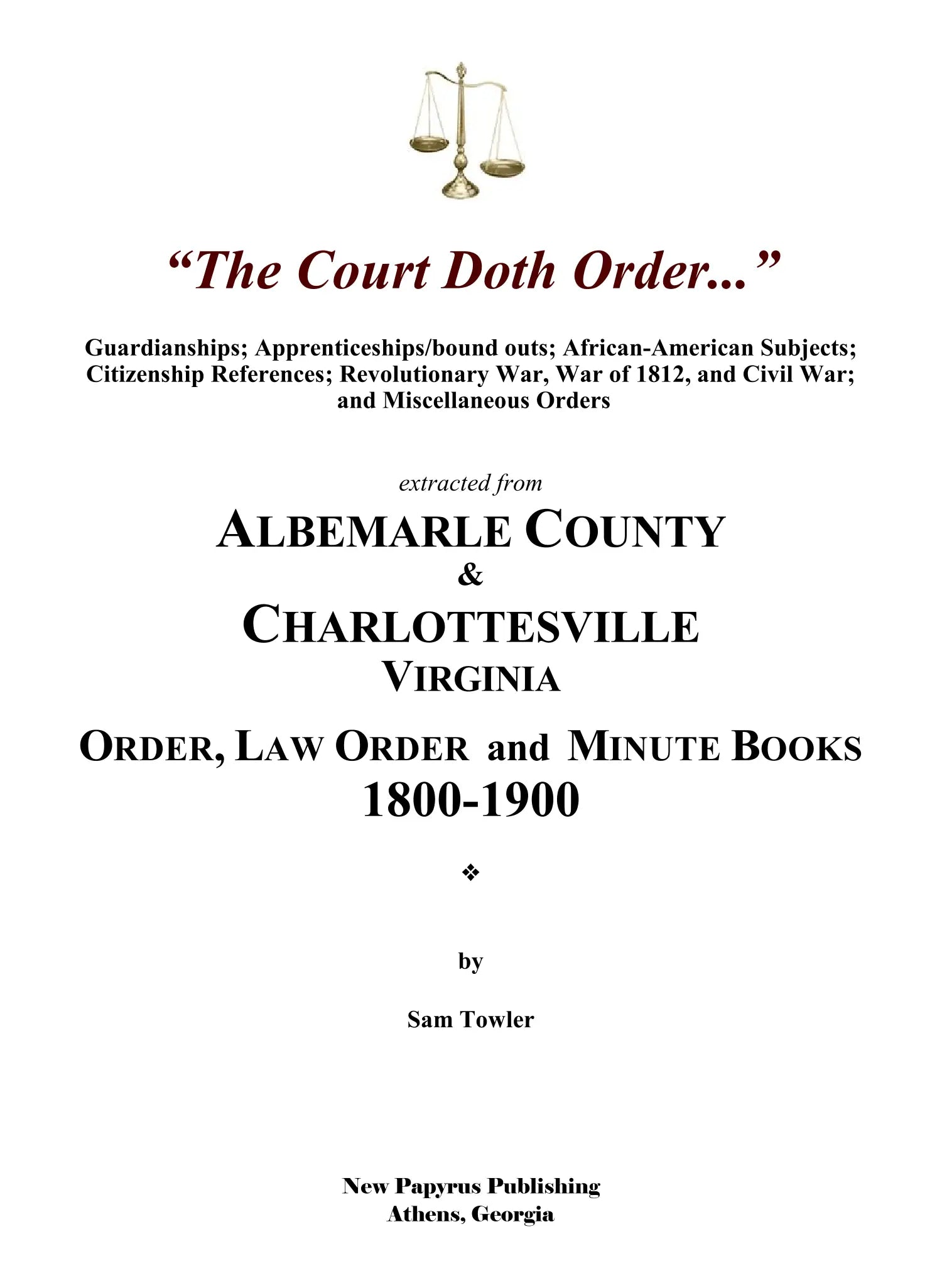 The Court Doth Order: Records from the Albemarle County and Charlottesville, Virginia Order, Law Order and Minute Books, 1800-1900