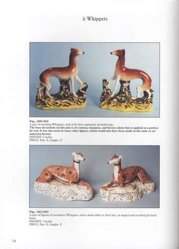 Histories for potteries known to produce Staffordshire dogs are presented, including James Dudson, the Par-Kent Factory, Poole & Unwin, Ridgway & Robey, and Sampson-Smith. Instruction on differentiating original antique Staffordshire dogs from modern reproduction are provided. The various decorative treatments used on these popular dogs over the decades are also discussed. Value codes are provided in every caption.