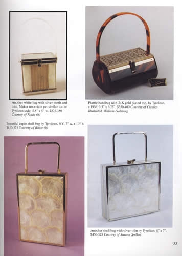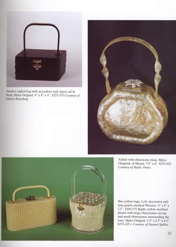 These unusual gems of wearable art are bringing large sums in today's collector's markets. Made with innovative plastics, they are now admired for their aesthetic value. Flip through the pages and enjoy one of the most whimsical collectibles from the atomic age of the fifties. Look in the attic for one of these treasures that someone stashed away in the late-50s and rediscover it today. The prices are skyrocketing. This comprehensive guide includes popular makers such as; Llewllyn, Myles, Gilli, Tyrolean, Rialto, Wilardy, Miami, Charles S. Kahn, Dorset-Rex,Maxim, and a variety of unmarked bags! A price guide is included.